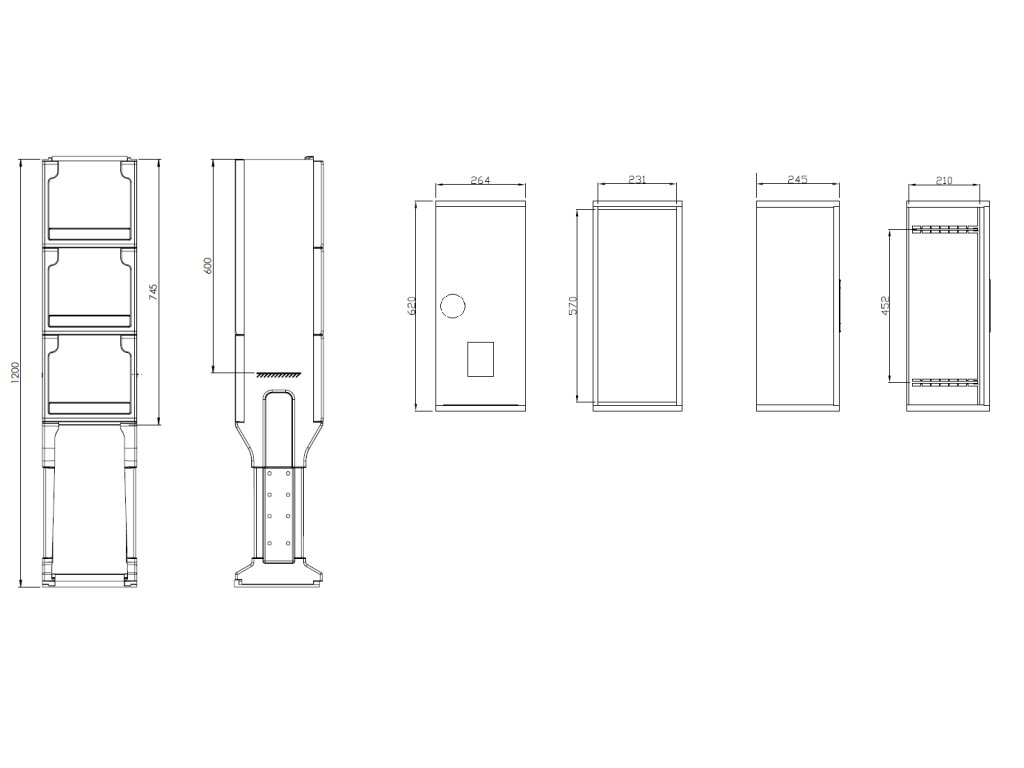 Skříně jsou vyrobeny v celoplastovém provedení z termosetu z SMC-prepreg materiálu, který je odolný proti povětrnostním vlivům, vodě a UV zářením. Prodloužení životnosti je navíc zajištěno UV ochranným nástřikem v barevném odstínu RAL7035. Materiál nepodléhá korozi, zachovává tvar, je nesnadno hořlavý kategorie B a samozhášivý. Vnitřní výzbroj jednosazbová slouží pro měření spotřeby el. energie. Obsahuje nastavitelný držák elektroměru, svorkovnice PEN, vypínač 63A 3P pro vývod max.16mm2, plombovatelný kryt a místo pro hlavní jistič. Silové vodiče jsou jednotné o průřezu 6mm2 pro osazení hlavního třífázového jističe do 40A. Hlavní jistič není součástí. Závěr rozváděčů je 1-bodový na trnový klíč 6 x 6 mm dle ČSN 359756.