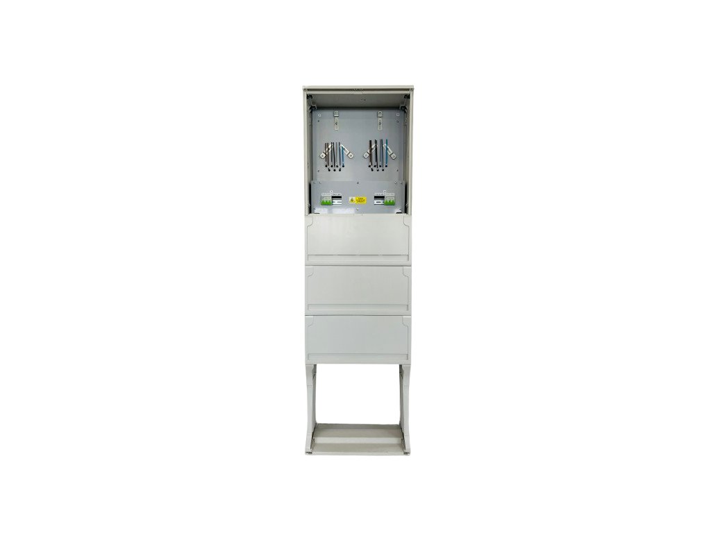Skříně jsou vyrobeny v celoplastovém provedení z termosetu z SMC-prepreg materiálu, který je odolný proti povětrnostním vlivům, vodě a UV zářením. Prodloužení životnosti je navíc zajištěno UV ochranným nástřikem v barevném odstínu RAL7035. Materiál nepodléhá korozi, zachovává tvar, je nesnadno hořlavý kategorie B a samozhášivý. Vnitřní výzbroj 2xjednosazbová slouží pro měření spotřeby el. energie. Obsahuje 2xnastavitelný držák elektroměru, 1xsvorkovnice PEN, 1xřadové svorky pro přívod max.16mm2, 2xvypínač 63A 3P pro vývod max.16mm2, plombovatelný kryt a 2xmísto pro hlavní jistič. Silové vodiče jsou jednotné o průřezu 6mm2 pro osazení hlavního třífázového jističe do 40A. Hlavní jistič není součástí. Závěr rozváděčů je 3-bodový na trnový klíč 6 x 6 mm dle ČSN 359756.
