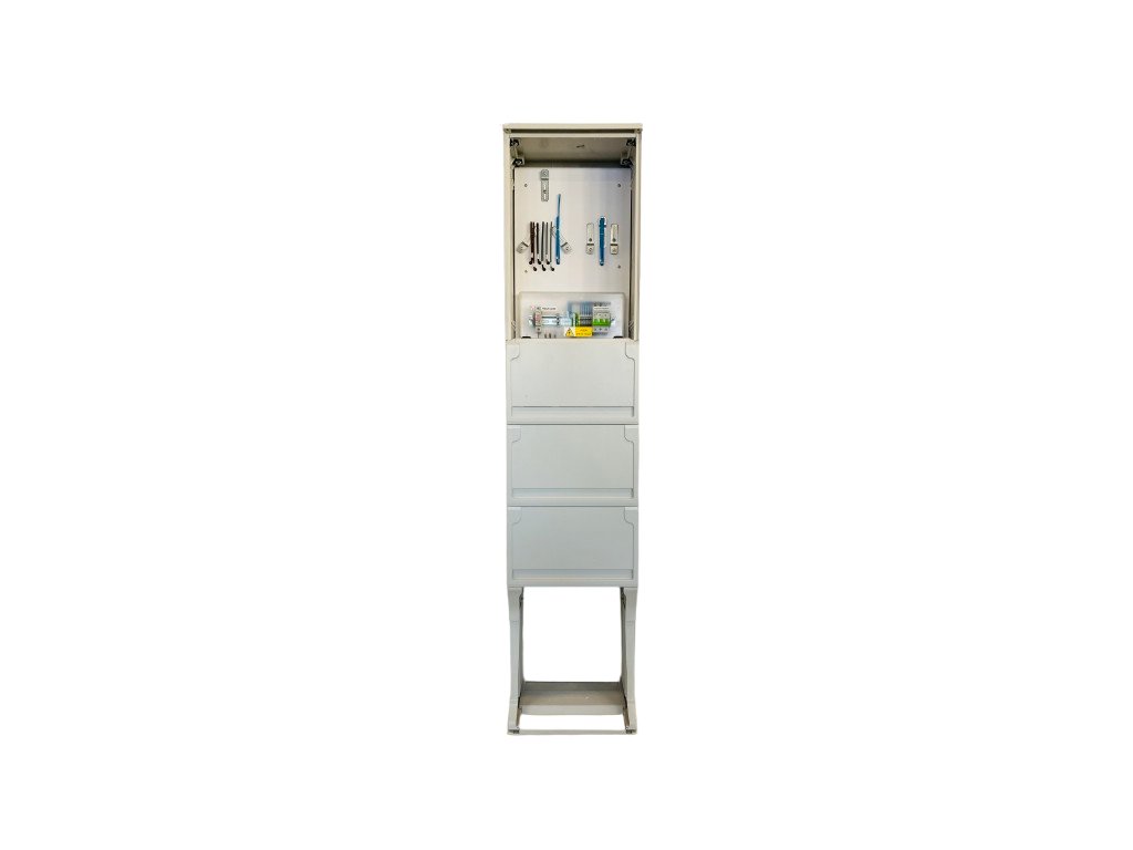 Skříně jsou vyrobeny v celoplastovém provedení z termosetu z SMC-prepreg materiálu, který je odolný proti povětrnostním vlivům, vodě a UV zářením. Prodloužení životnosti je navíc zajištěno UV ochranným nástřikem v barevném odstínu RAL7035. Materiál nepodléhá korozi, zachovává tvar, je nesnadno hořlavý kategorie B a samozhášivý. Vnitřní výzbroj jednosazbová/dvousazbová/dvousazbová pro FVE slouží pro měření spotřeby el. energie. Obsahuje nastavitelný držák elektroměru a HDO, jistič přijímače HDO-2B1,svorkovnice PEN, vypínač 63A 3P pro vývod max.16mm2, plombovatelný kryt a místo pro hlavní jistič. Silové vodiče jsou jednotné o průřezu 10mm2 pro osazení hlavního třífázového jističe do 63A. Hlavní jistič není součástí. Závěr rozváděčů je 3-bodový na trnový klíč 6 x 6 mm dle ČSN 359756.