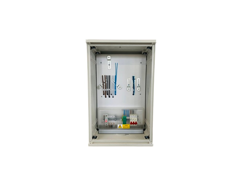 Skříně jsou vyrobeny v celoplastovém provedení z termosetu z SMC-prepreg materiálu, který je odolný proti povětrnostním vlivům, vodě a UV zářením. Prodloužení životnosti je navíc zajištěno UV ochranným nástřikem v barevném odstínu RAL7035. Materiál nepodléhá korozi, zachovává tvar, je nesnadno hořlavý kategorie B a samozhášivý. Vnitřní výzbroj jednosazbová/dvousazbová/dvousazbová pro FVE slouží pro měření spotřeby el. energie. Obsahuje nastavitelný držák elektroměru a HDO, jistič přijímače HDO-2B1,svorkovnice PEN, vypínač 100A 3P pro vývod max.16mm2, plombovatelný kryt a místo pro hlavní jistič. Silové vodiče jsou jednotné o průřezu 16mm2 pro osazení hlavního třífázového jističe do 80A. Hlavní jistič není součástí. Závěr rozváděčů je 1-bodový na trnový klíč 6 x 6 mm dle ČSN 359756.