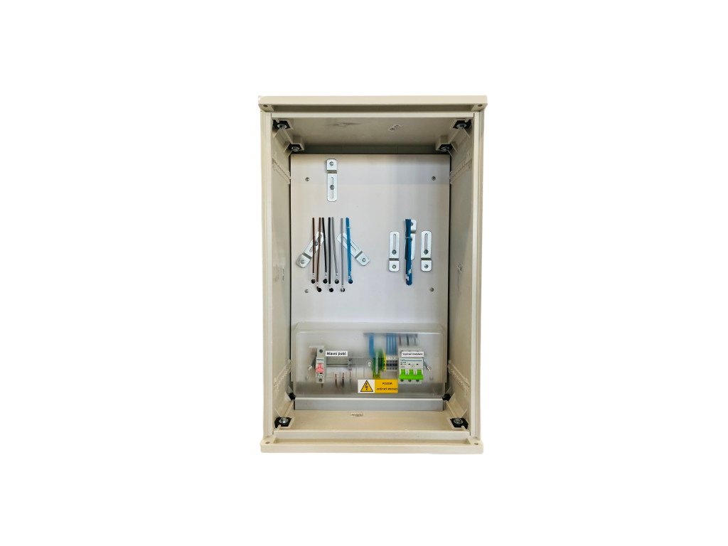 Skříně jsou vyrobeny v celoplastovém provedení z termosetu z SMC-prepreg materiálu, který je odolný proti povětrnostním vlivům, vodě a UV zářením. Prodloužení životnosti je navíc zajištěno UV ochranným nástřikem v barevném odstínu RAL7035. Materiál nepodléhá korozi, zachovává tvar, je nesnadno hořlavý kategorie B a samozhášivý. Vnitřní výzbroj jednosazbová/dvousazbová slouží pro měření spotřeby el. energie. Obsahuje nastavitelný držák elektroměru a HDO, jistič přijímače HDO-2B1, svorkovnice PEN, vypínač 63A 3P pro vývod max.16mm2, plombovatelný kryt a místo pro hlavní jistič. Silové vodiče jsou jednotné o průřezu 6mm2 pro osazení hlavního třífázového jističe do 40A. Hlavní jistič není součástí. Závěr rozváděčů je 1-bodový na trnový klíč 6 x 6 mm dle ČSN 359756.